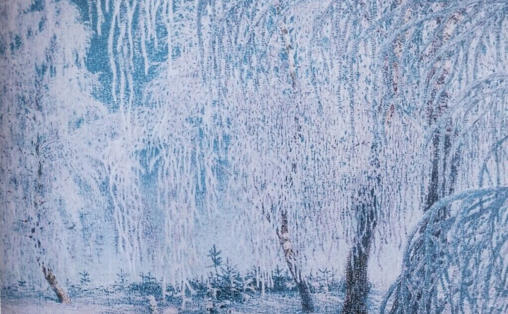 Ребята с удовольствием рассмотрели знаменитые полотна художника — «Февральская лазурь», «Мартовский снег», «Зимний вечер», «Иней». Юные художники научились замечать, как Грабарь выстраивает композицию, играет с рефлексами и тенями, использует контрасты синего, розового и золотистого, чтобы передать ощущение морозного дня. Дети увидели, что художник не просто фиксировал природу, а создавал особую поэтическую реальность, где зима предстаёт не суровой, а волшебной, полной тихого сияния.