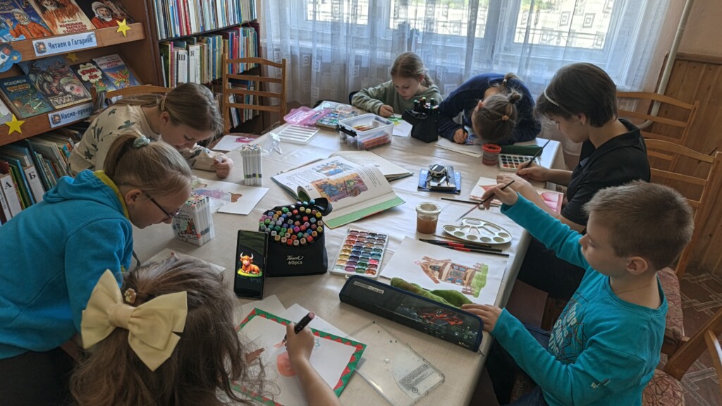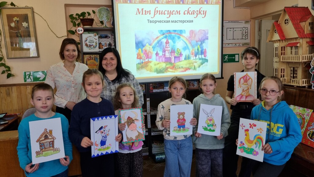 Затем началась самая увлекательная часть: ребята приступили к рисованию доброго Зайчика, хитрой Лисы, отважного Петуха и других обитателей леса. Юные художники использовали разные техники: одни работали акварелью, создавая мягкие цветовые переходы, другие — яркими фломастерами, подчёркивая контуры персонажей. Когда рисунки были готовы, все работы разместили на импровизированной выставке в читальном зале.
